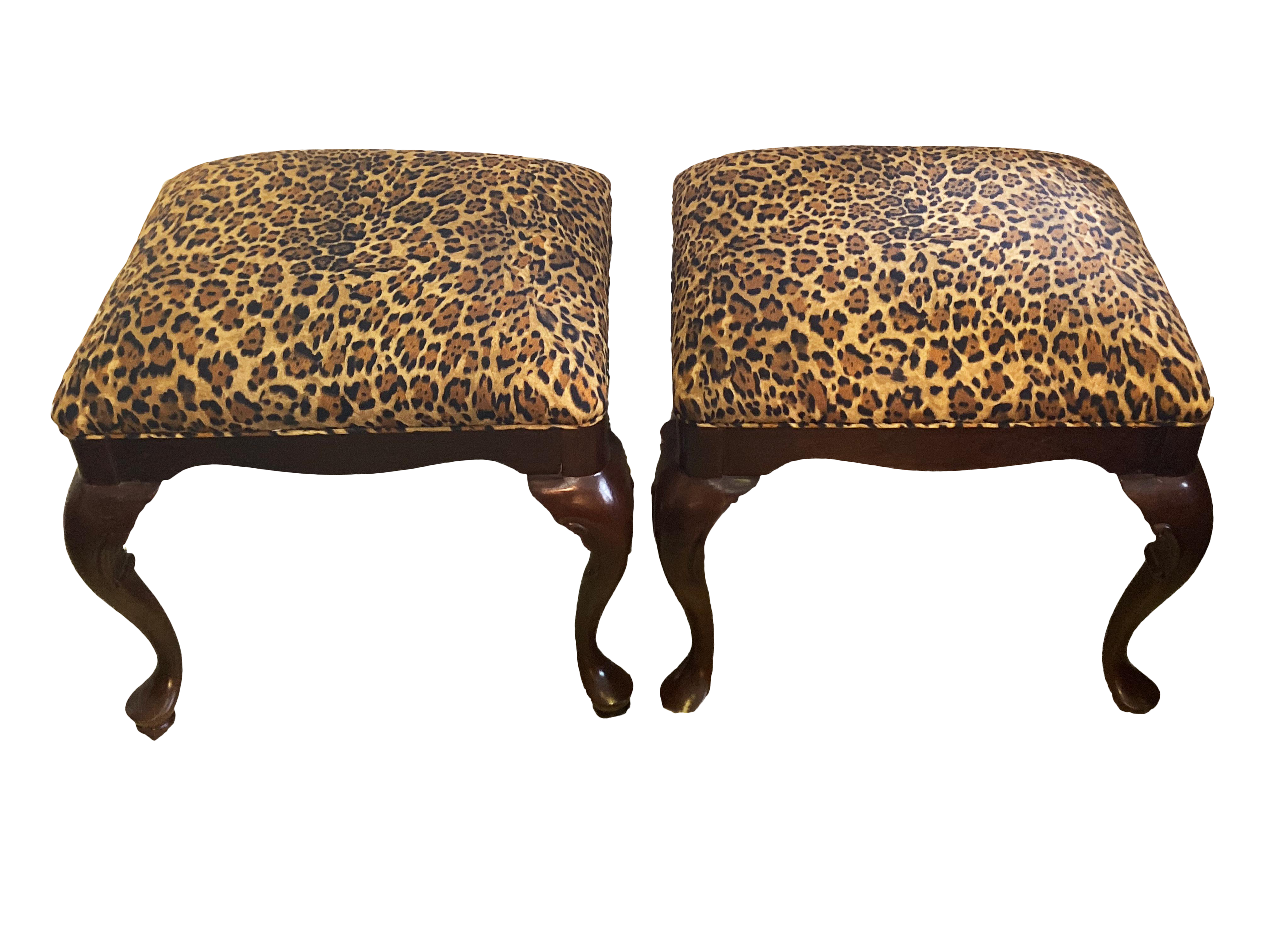 Mahogany Wood Queen Anne Pair Of Stools With Animal Print Chairish