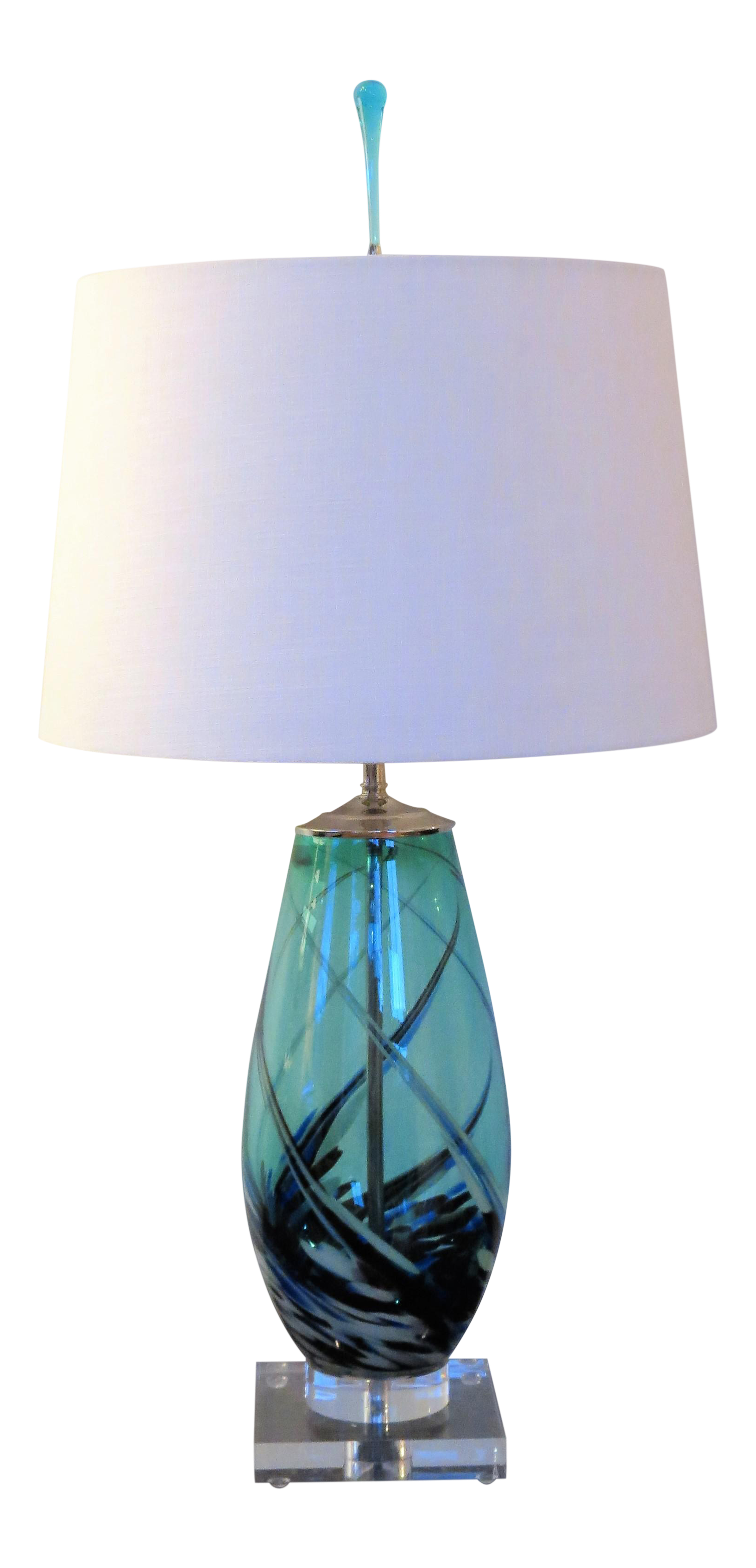 Art Glass Lamp With Shade Aqua Blue With Swirls Lucite Base